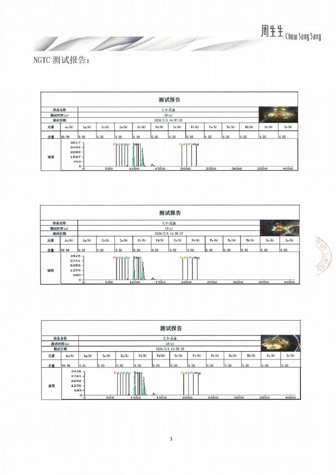 同时,今日2月3日,我司已将同批次同款福袋送检至国家珠宝玉石首饰检验集团有限公司(NGTC),采用X射线荧光谱法(XRF)进行检测,该福袋货品的检测结论为足金饰品(报告编号:P-ZSSA2121621)。NGTC对该货品随机选取3个检测点,检测所得金含量结果依次为99.99%、99.99%、99.98%(详见附件)。感谢社会各界的关注和监督,我司正全力配合相关部门开展工作,相关进展我们将及时公布。