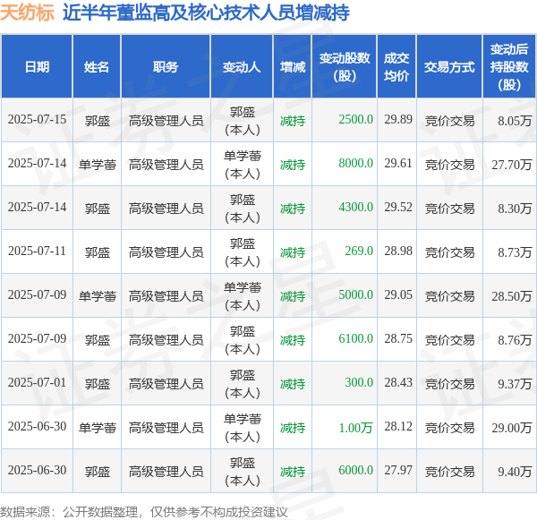 天纺标近半年内的董监高及核心技术人员增减持详情如下: